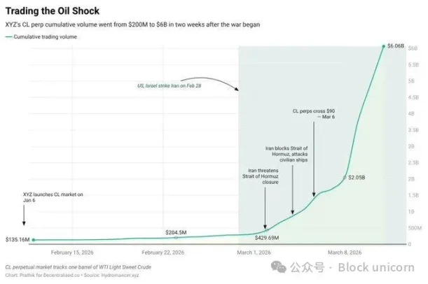 战争爆发后短短两周内,与石油挂钩的永续合约的交易量就从 2 亿美元激增至累计 60 亿美元。