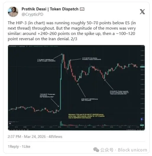Saurabh 在 Decentralised.Co 的推文中写道:「2 月 28 日,美国和以色列在传统市场休市期间袭击了伊朗。几个小时内,Hyperliquid 平台上与石油挂钩的永续合约价格飙升了 5%,因为交易员们实时消化了这一冲击。」