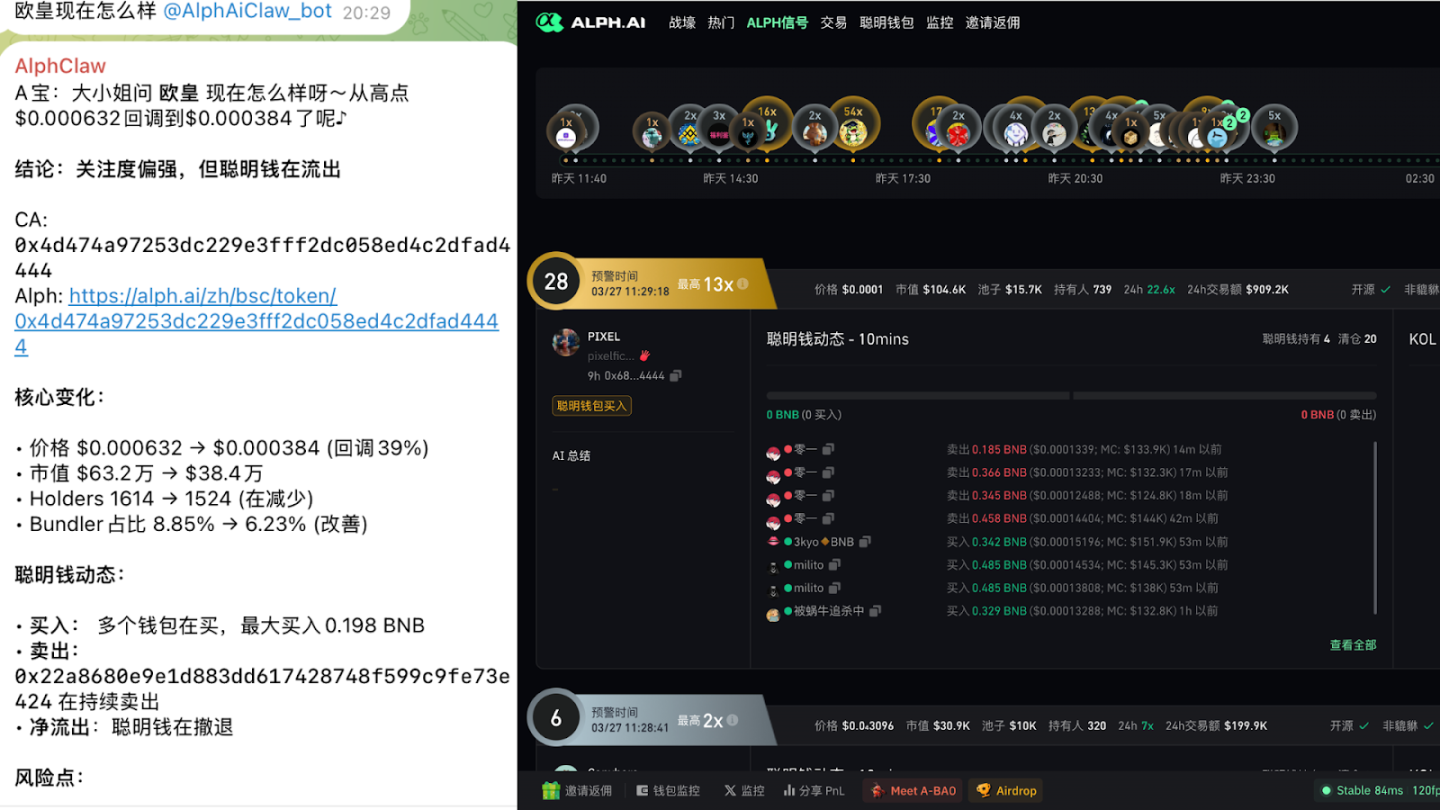 肯定还是产品本身要跟上这一轮 AI 的变化。你会发现现在做交易这件事,单纯工具已经不太够了,所以我们最近开放的 AlphSkill,在 TG 推广使用的 AlphClaw 名为 A 宝 其实就是在往这个方向走,它做的事情更直接一点,就是把原本分散在各个链上的数据和信息,尽量做到更完整地拿到并在优化分析后给到用户,让用户不用再自己去拼信息。