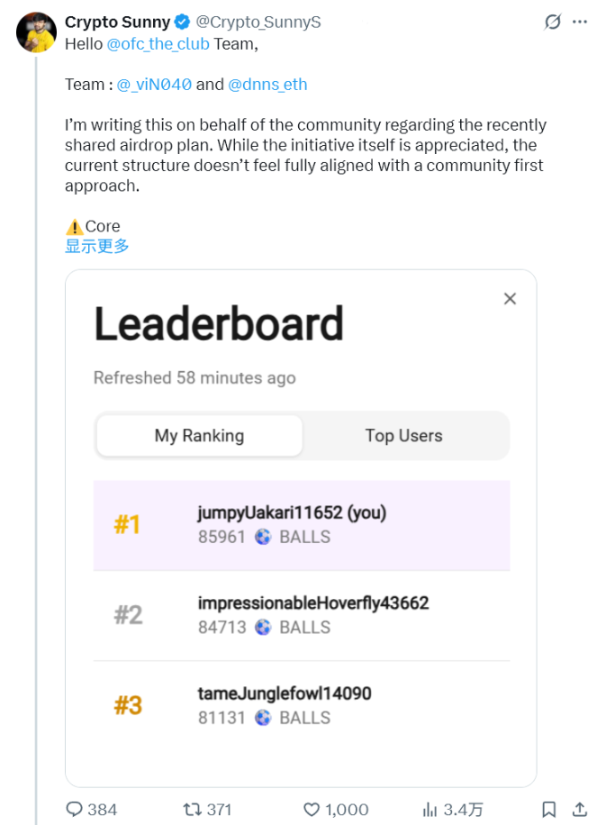 要求退还徽章费用的呼声此起彼伏。4 月 7 日,一封自称 BALLS 排行榜排名第一的用户 @Crypto_SunnyS 撰写的公开信在 X 引发热议。他主动请求项目方削减自己 75% 的代币分配,将份额重新分配给更多参与者,并建议将奖励范围扩大至至少 7.5 万人、TGE 当日解锁 60%。