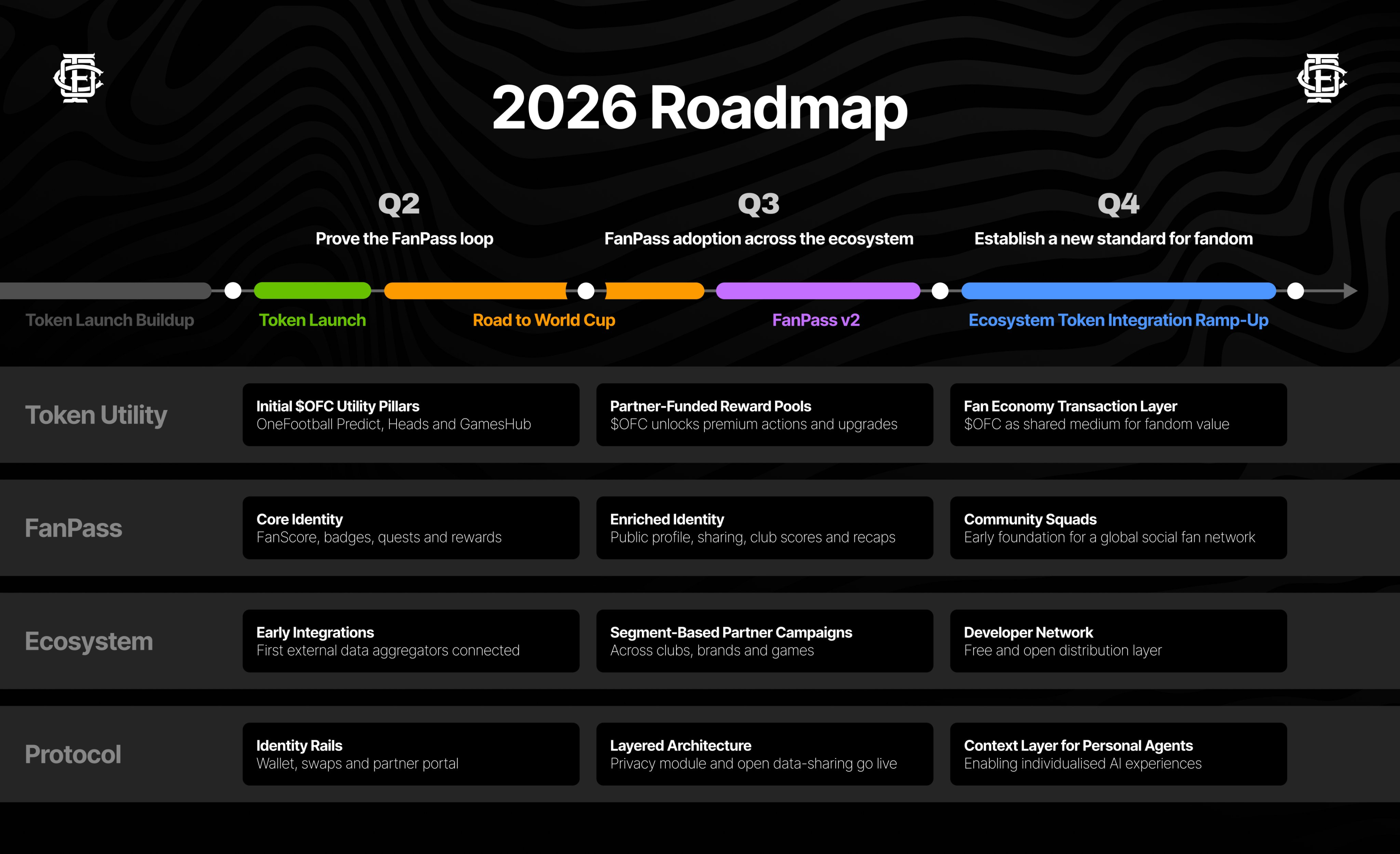 2026 年路线图显示,Q2 将推出链上「Fan-Graph」身份系统,Q3 进入「Road to World Cup」阶段,含 FanPass v2 与合作伙伴奖励池;Q4 目标是搭建粉丝经济交易层和开发者网络,官方设定增长目标为 50 万钱包和 100 万笔链上交易。
