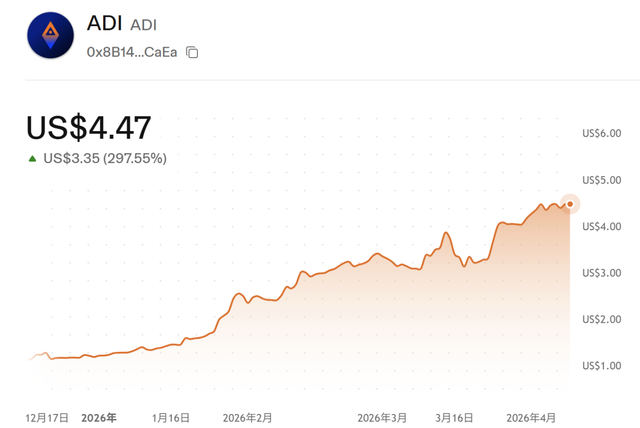 4 月 2 日,国际足联宣布与 ADI Predictstreet 达成多年合作协议,宣布其为 FIFA 世界杯 2026 的官方预测市场合作伙伴。短短几天内,其底层技术支持的 ADI Chain 原生代币 ADI 价格从底部快速拉升至历史新高,从 2025 年年底至今,代币价格涨幅已超过 4 倍。