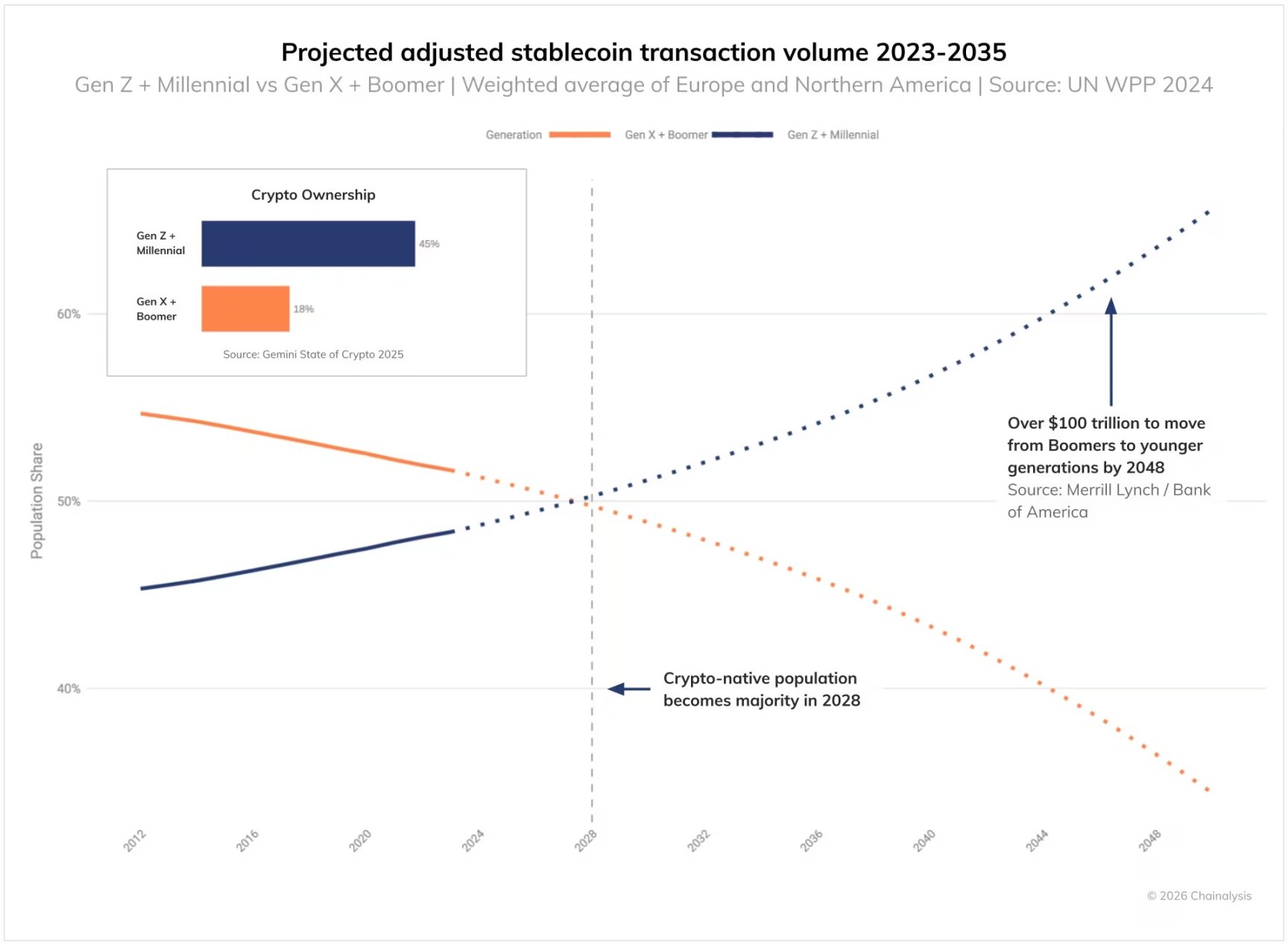 从 2028 年左右开始,北美与欧洲的传统金融机构将面临重大人口结构转变。千禧一代与 Z 世代(近半数持有加密资产)将成为成年人口主体,逐步取代 X 世代与婴儿潮一代成为核心金融群体。