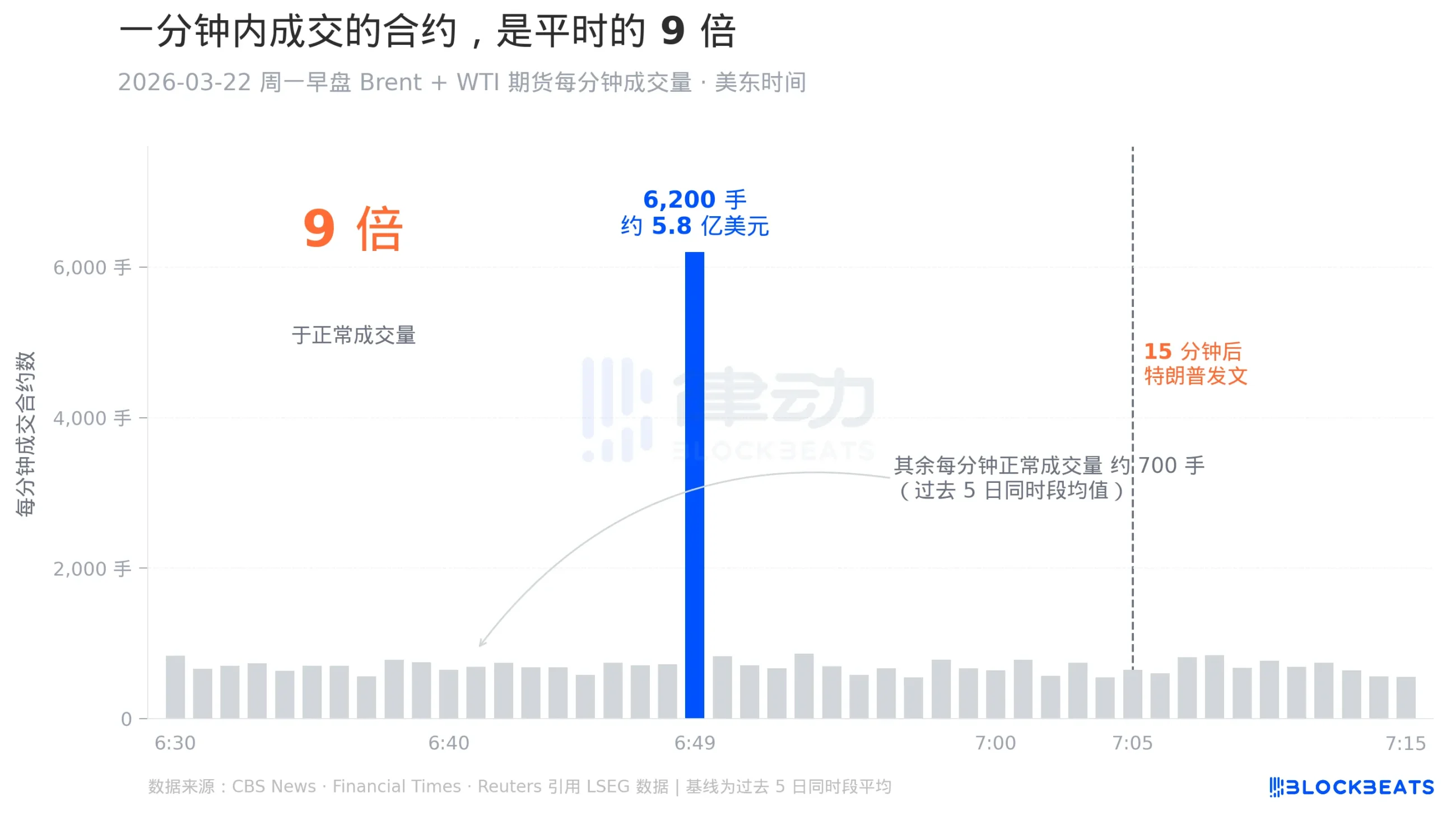 2026 年 3 月 22 日周一早盘的那一次没有 4 月 7 日这次出名,因为没有引发油价的大幅下跌。但从交易结构上看,它才是这套「剧本」的原型。据 CBS News 和 Financial Times 引用的交易数据,那天美东时间 6:49 到 6:50,也就是 GMT 10:49 的一分钟之内,布伦特加 WTI 期货共成交 6,200 手,约合 5.8 亿美元。