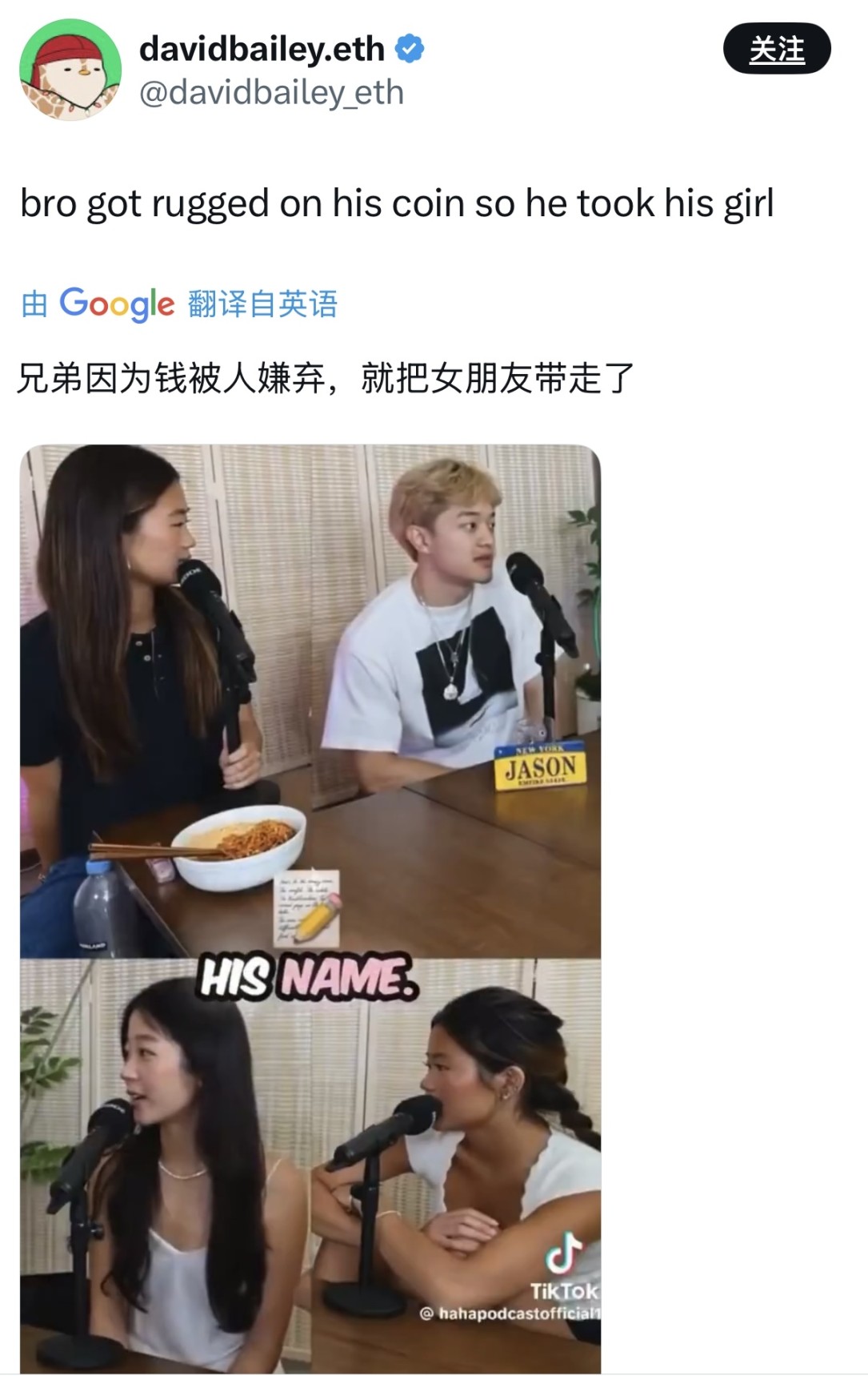 据说那个韩国人就是图片里的 Jason,他曾在采访中透露自己在 Believe 上亏了钱。这次居然把项目创始人的女朋友带走了🤣。