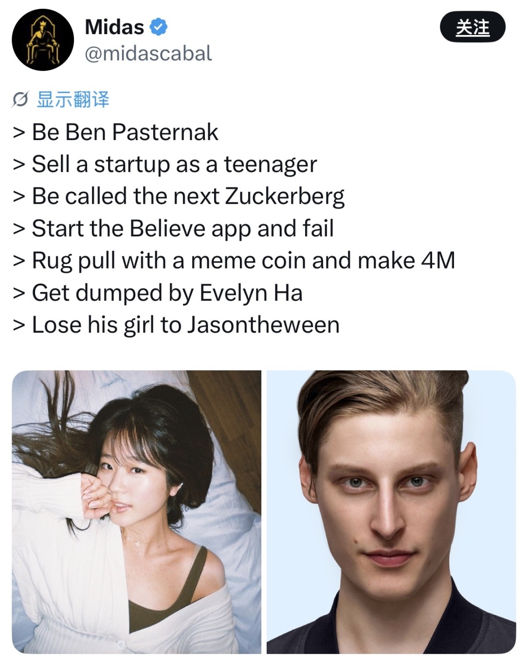 主角叫 Ben Pasternak,Solana 上 2025 年爆火的项目之一 Believe 的创始人。据说 Ben 当年圈了 4000 万美元,口碑一直有争议,很多人骂他是骗子。后来项目爆火,他飘了,开始追起了韩国网红。