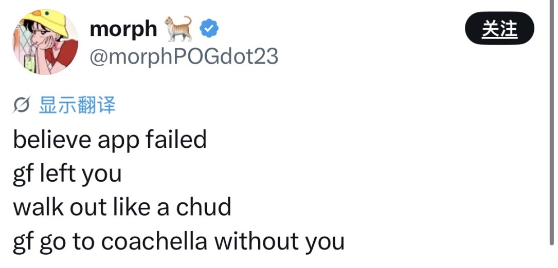 网友「遗憾」的表示,Believe 应用失败了,女朋友离开了你,像个 chud 一样离开(注:「chud」为网络俚语,常带有贬义或讽刺色彩),女朋友没带你去科切拉(Coachella)音乐节。