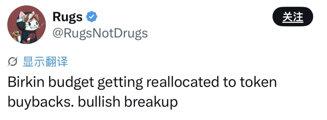 买爱马仕 Birkin 包的预算正被重新分配到代币回购上。分手看多!(注:分手反而带来利好预期,比如资金回流投资等,类似「利空出尽是利好」的玩梗表达)。