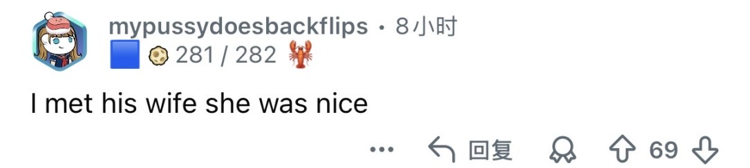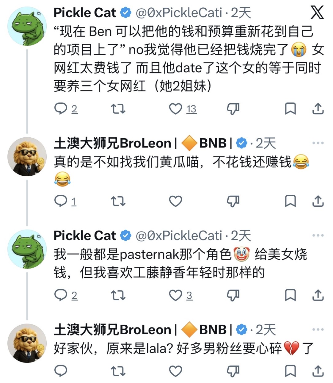 博主 Pickle Cat 评论说:Ben 的钱早就烧光了😭,根本没法「重启项目」;因为他在养一个女网红,还得顺带养她的两个姐妹,实在太费钱;最后还自嘲了一句:我一般是给美女烧钱的人,但我其实更喜欢工藤静香年轻时的样子。
