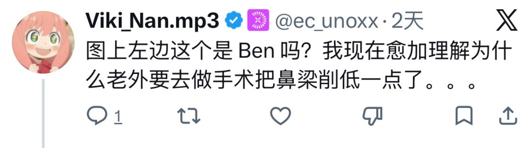网友看了 Ben 的照片后辣评:现在愈加理解为什么老外要做手术把鼻梁削低一点了。