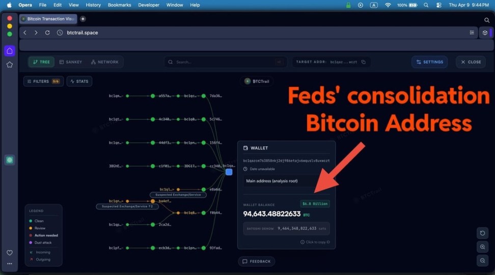 帖主分析了美国司法部的一个归集地址,2022 年他们从 Bitfinex 黑客 Ilya Lichtenstein 和他的妻子那里没收了 94,643 枚被盗比特币(实际共 12 万枚)。