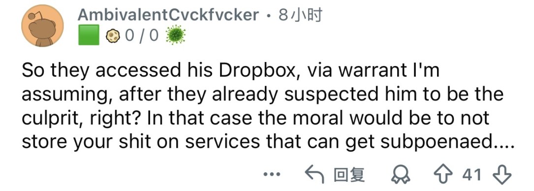 网友辣评:所以我猜他们是通过搜查令访问了他的 Dropbox,在他们已经怀疑他是罪魁祸首之后,对吧?那样的话,教训就是不要把你的东西存到会面临传票风险的服务器上。