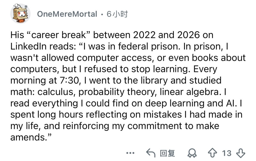 网友评论说:他在领英上的 2022 到 2026 年的「职业空窗期」描述是:「我在联邦监狱服刑。在监狱里,我不被允许使用电脑,甚至不允许看关于电脑的书,但我拒绝停止学习。每天早上 7:30,我会去图书馆学习数学:微积分、概率论、线性代数。我读了我能找到的关于深度学习和人工智能的一切。我花了很长时间反思我人生中犯过的错误,并强化我弥补错误的决心。」