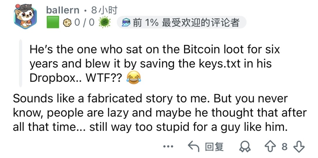网友辣评:就是他,把比特币赃款藏了六年,结果因为把 keys.txt 存在 Dropbox 里搞砸了😂。
