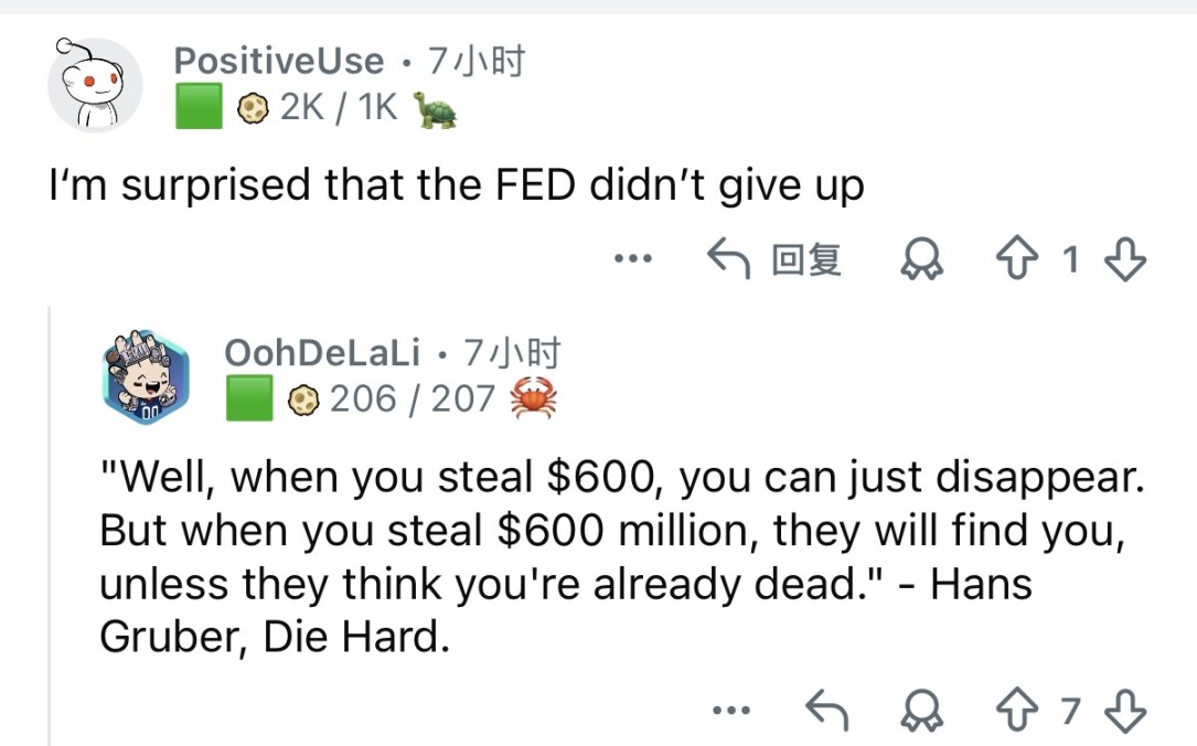 评论区回复称,「当你偷走 600 美元时,你可以直接消失。但当你偷走 6 亿美元时,他们会找到你,除非他们认为你已经死了。」— 《虎胆龙威》里的汉斯·格鲁伯。