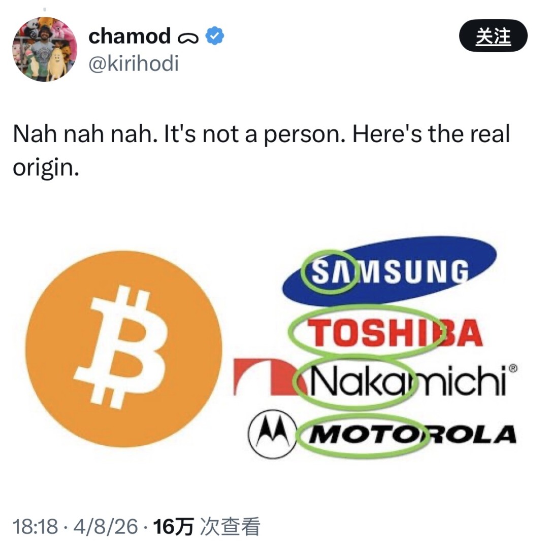 网友辣评:中本聪不是具体的某个人。图中才是真正的比特币起源。(注:坊间曾流传比特币创始人中本聪 Satoshi Nakamoto 是由三星、东芝、中道、摩托罗拉四家公司名称的部分字母拼接而成,这只是未经证实的趣味猜测。)