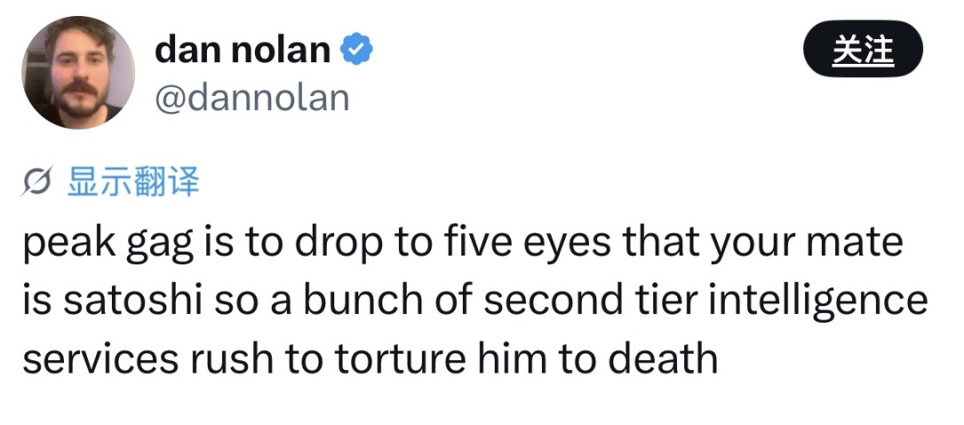 网友表示,最高级的恶作剧就是向「五眼联盟」告密说你哥们儿是中本聪,这样一堆二线情报机构就会争先恐后地去折磨他。
