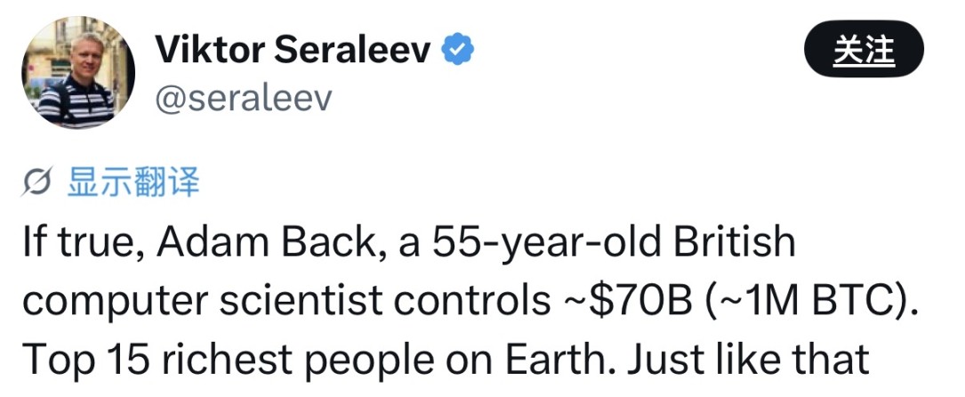 网友评论说:如果这是真的,Adam Back,一位 55 岁的英国计算机科学家掌控着 700 亿美元(约 100 万枚 BTC)的资产。他会是地球上最富有的 15 人之一,就这么简单。
