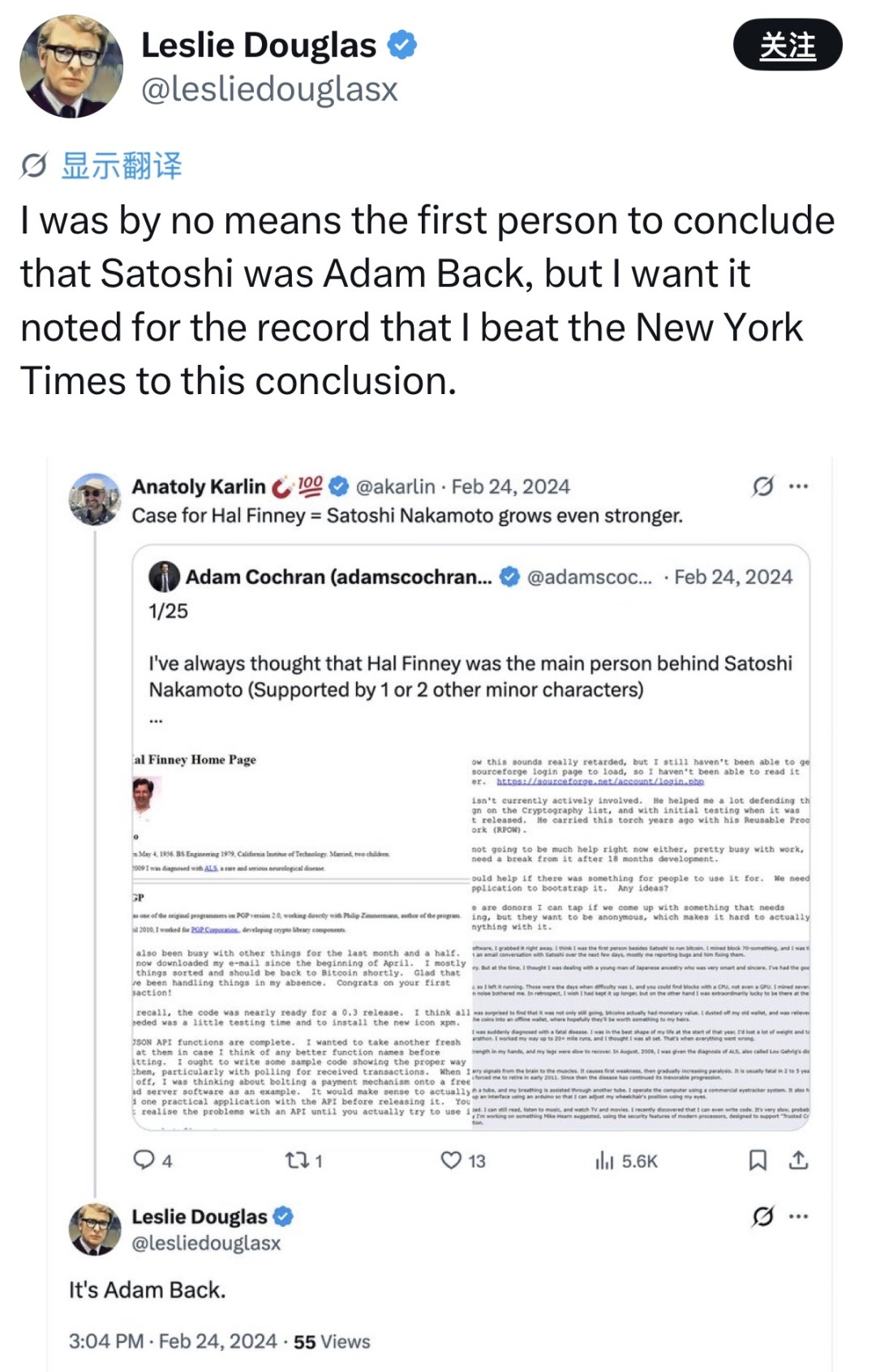 还有一位网友拿出了他在 2024 年评论说 Adam Back 就是中本聪的截图,并表示我绝不是第一个得出「中本聪是 Adam Back」结论的人,但我希望记录下来:我比《纽约时报》更早得出这个结论。