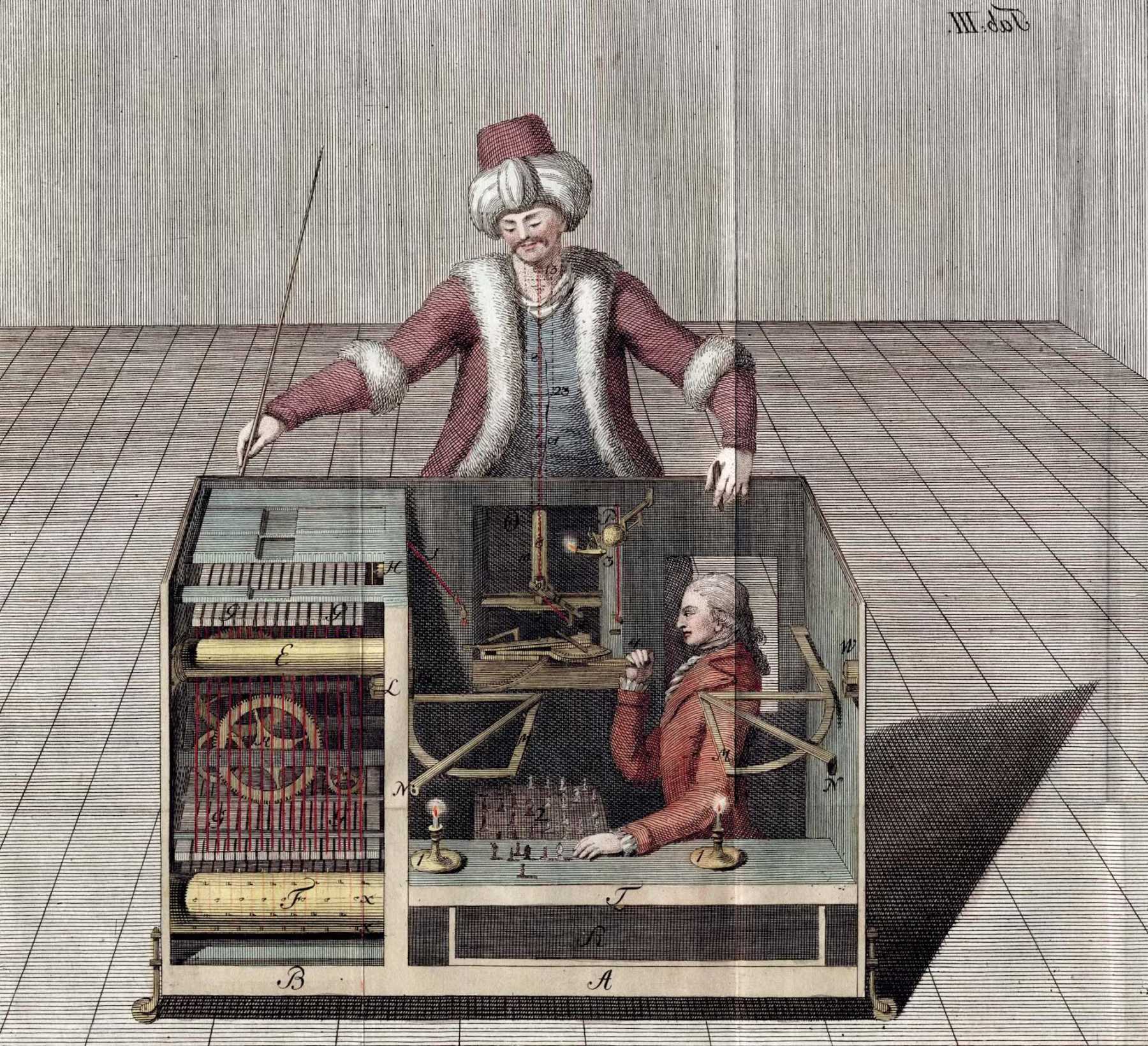 1789 年的机械土耳其人是一款下棋机器,表面上看起来自主运行,但实际上依靠一名隐藏的人工操作员