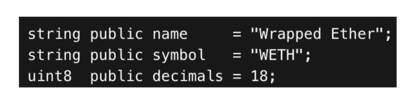 代币真实性和元数据是同一个问题。代币看似能自我描述。但代币元数据并不具备权威性,只是代码返回的字节数据。典型案例是封装以太坊(WETH)。广泛使用的 WETH 合约代码中明确定义了名称、符号和精度。