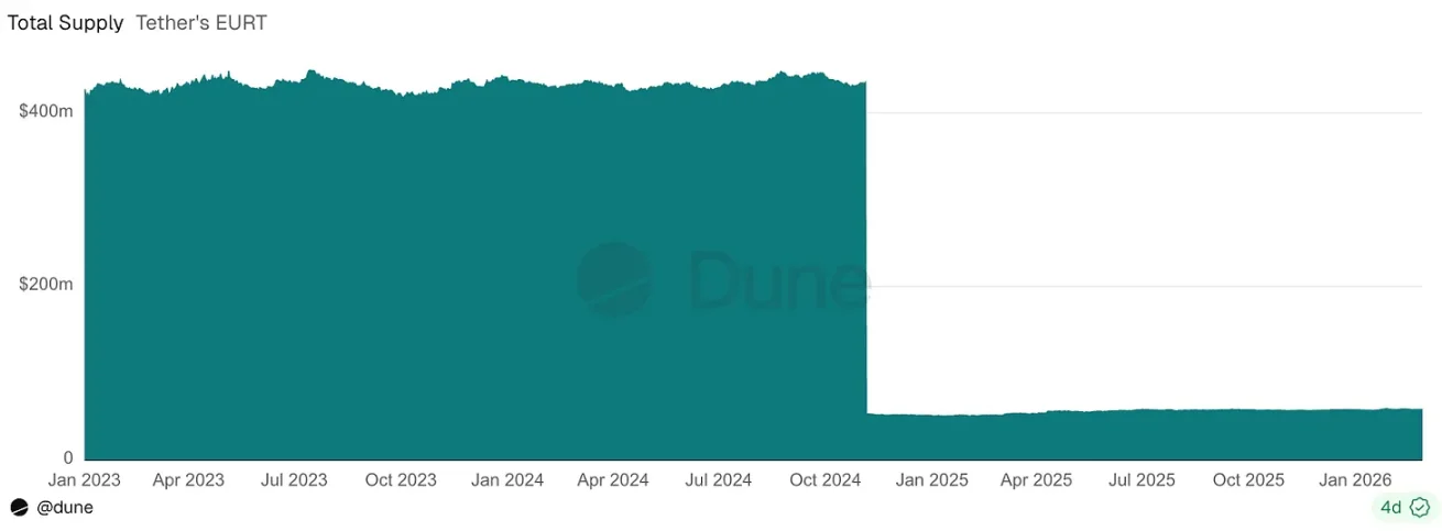 监管的决定性作用,在 Tether 欧元稳定币的命运上体现得淋漓尽致。2024 年欧盟 MiCA 法规正式落地,几乎直接宣判 EURT 的衰落。