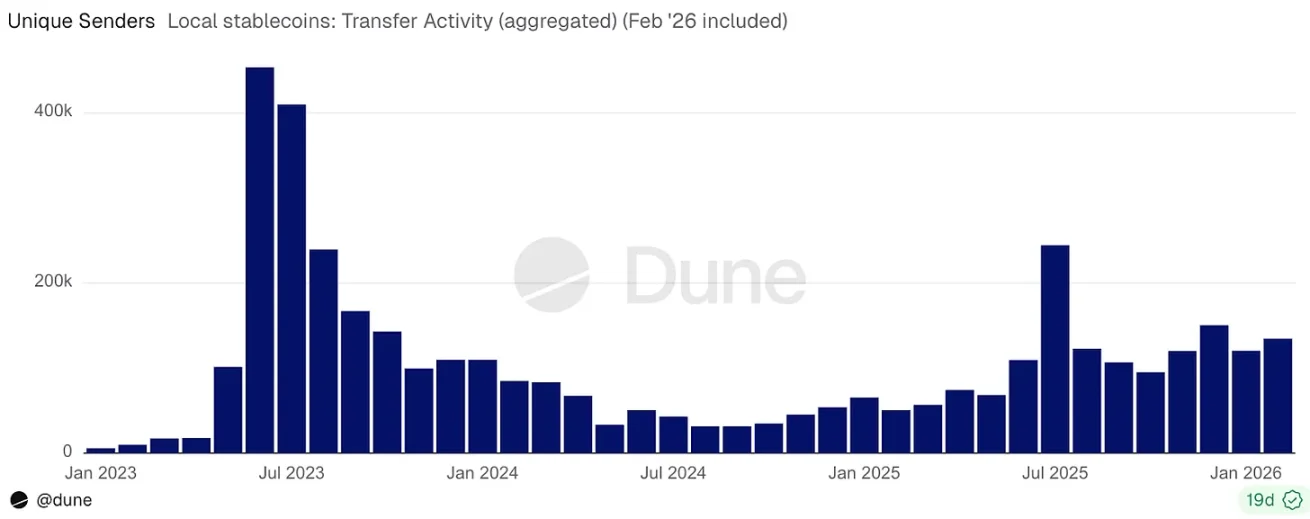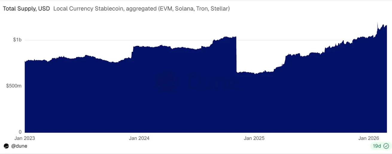 如果排除 EURT,非美元稳定币总供应量实现近三倍增长,从 2023 年 1 月约 3.5 亿美元,攀升至 2026 年 2 月的 11 亿美元。