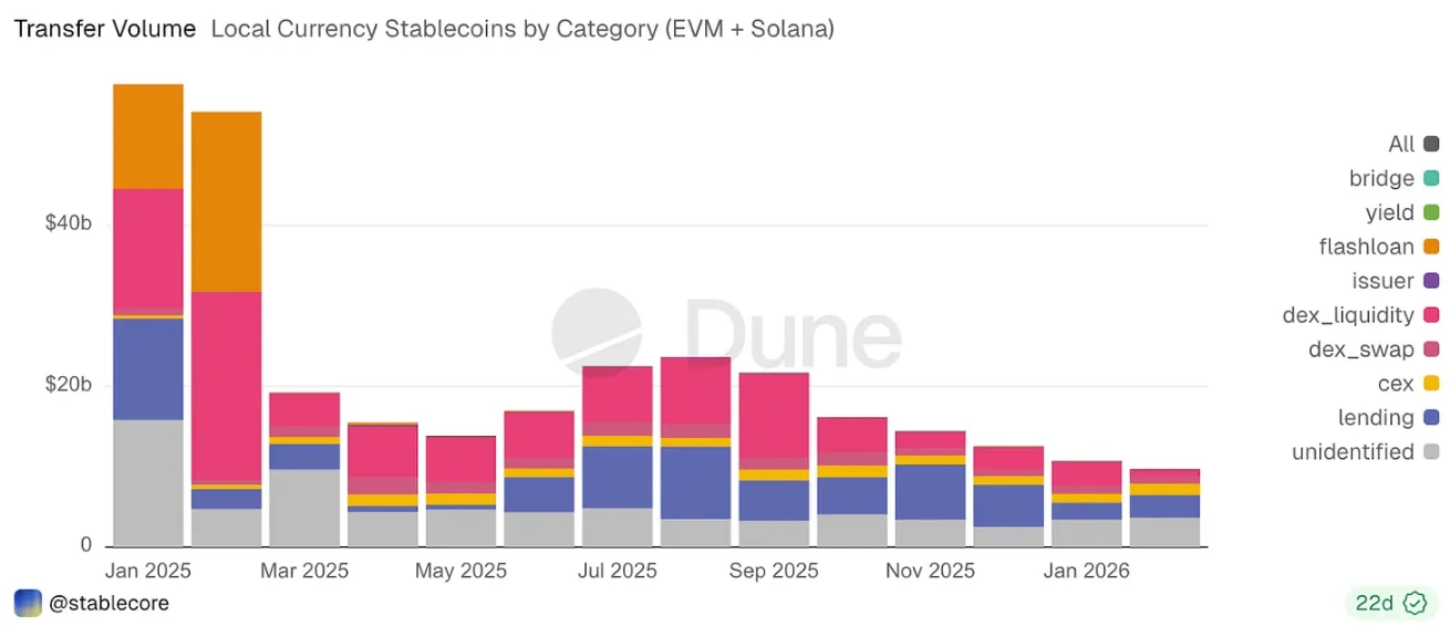 欧元稳定币占据非美元稳定币总转账体量的 90% 以上,早已成为独立的标准化金融标的。用户将其存入借贷池、在去中心化交易所交易,视作可生息、可抵押、全链流通的链上现金,这也让本土法币稳定币整体呈现出更为成熟的金融业态。